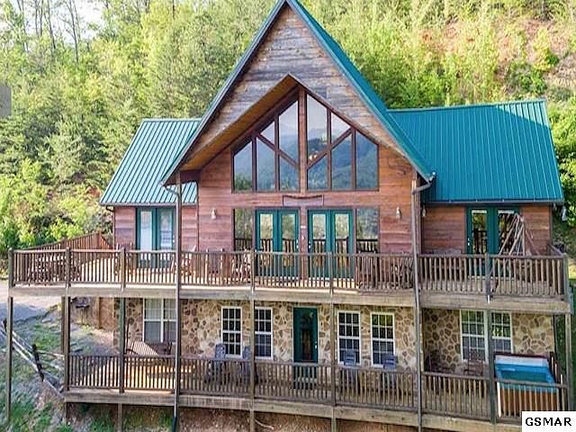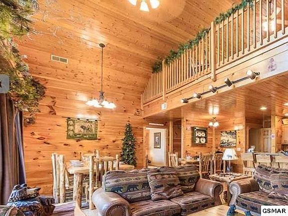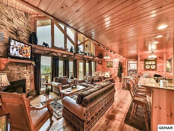 WOW! Welcome to "Beary Viewtiful!!"! Overlook beautiful Wears Valley and the Great Smoky Mountains. This Cabin has 4 master bedrooms, 4.5 bathrooms with additional sleeping area in loft. The main level features an open floorplan, granite countertops, recessed lighting and to mirror image master suites on each side of the living/dining/kitchen area. The main level has a wide open living space with beautiful floor-to-ceiling, stacked stone, gas fireplace Just through the front door is a cabin length front deck with lots of seating and sunshine!!The lower level features its own private entrance, outdoor hot tub, grilling area, Home Theater and recreation room. It also features the same split bedroom plan as the main floor. Dual master suites with private baths and whirlpool tubs! The setting offers you ridge top privacy with 2 full length covered porches complete with rocking chairs, porch swings, and picnic table for those lazy afternoons. You can enjoy the stunning vistas in the daytime as well as the twinkling lights of the valley at night.
