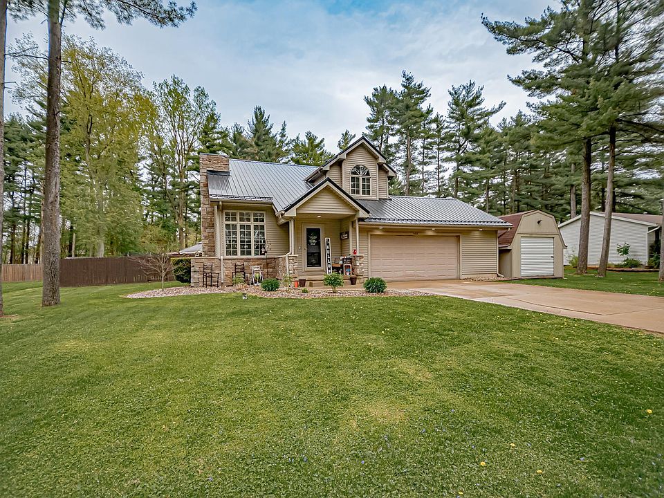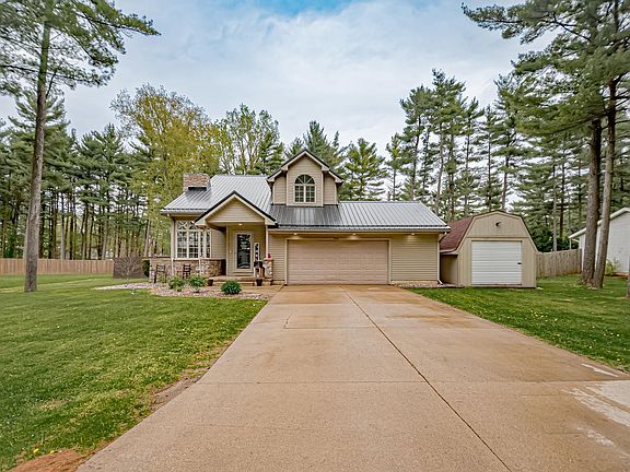 Absolutely adorable home in the rural neighborhood, The Pines. You will love the charm and curb appeal from the moment you pull up! Inside the home welcomes you with a spacious living room with vaulted ceilings and great natural light. The main level also offers a nice size eat in kitchen with large dining area, as well as a main level half bath, and a laundry room that offers a utility sink and storage closet. Upstairs offers 3 bedrooms & 2 full baths. The master bedroom has vaulted ceilings, private bathroom, & walk in closet. If you need more space, the basement is drywalled, has a wet bar to install, storage closets, and ready to be finished to give you an additional 1500 square feet! Updates to the home include: brand new metal roof with a transferable lifetime warranty, new LED lighting in dining room, fresh paint, brand new carpet upstairs (April 2023), and new flooring on the main level. If you are a garage lover, you will love the oversized garage that has been recently updated with shop lighting and epoxy flooring. Lastly, the outside offers a spacious fenced in yard, mature trees, firepit area, deck, and new storage shed. This home has so much to offer, be sure to check it out!