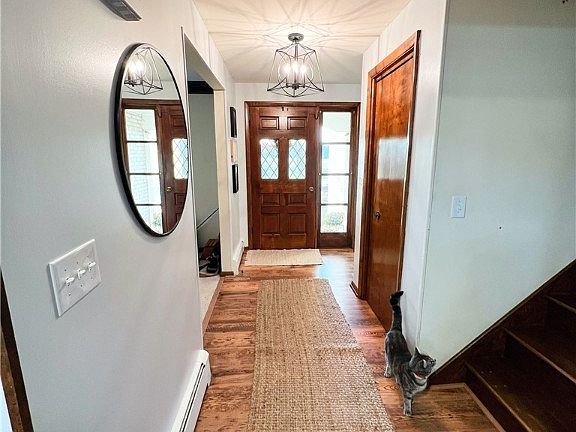Inside, you'll find plenty of space to spread out and enjoy the benefits of an open floor layout. The front door welcomes you to a functional entryway leading to a spacious living area that opens into the dining room. The modern eat-in kitchen features butcher block counter tops, open shelving, stainless appliances and overlooks the cozy family room. The wood burning fireplace and wood beams make the living area feel like a peaceful retreat. Family room also leads to a first floor 1/2 bath and outdoor living area. Upstairs you will find a very spacious master bedroom with double closets, an updated full bath, and 2 additional bedrooms. And, it doesn't stop here........the outside space has breathtaking views, privacy, and room to run. This home can be yours to enjoy the abundance of fall beauty