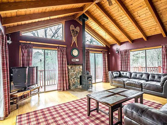 Welcome home to this inviting updated Cape with open floor plan! Kitchen boasts custom cabinets, limestone counters, and stainless steel appliances w/ 6-burner Viking stove. Family room w/ abundance of natural sunlight and vaulted ceiling leads to spacious deck. Custom office on first floor. Master suite includes double-sided fireplace. Tremendous storage options. Built-in cubbies in mud room. HW floors throughout. Large walkout basement leads to private 1 acre lot bordering the Lisha Kill Creek.