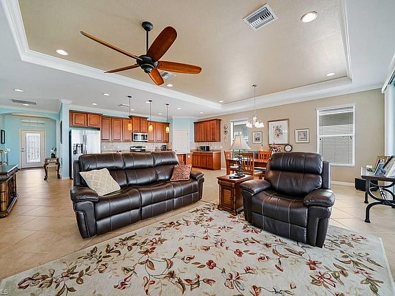 This home is impeccably kept with a wide open floor plan! As you enter this 2 bedroom w/den home you will be delighted to see that the owner has provided all the little extras that one desires. Starting with the screen enclosed front entranceway and decorative glass door with roll up hurricane shutter. There are also hurricane accordian shutters on all windows and the lanai area. Outside gutters have been provided on all sides. Tray ceilings in the foyer,den,living area and master along with crown molding throughout compliment the tile in the living areas. There is so much storage! Starting with extra cabinets all the way around the FLAT kitchen island that looks out to the gorgeous lake view and huge oversized lanai. The master bedroom has vinyl plank tile and the dual closets have been customized. Some unexpected bonuses are the hall closet with floor to ceilling built in cabinets, spacious laundry room w/folding area, utility sink w/upper and lower cabinets. The garage is every man and woman's dream with it's over head storage, custom wall hanging, custom closets on all wall sides, acrylic floors, added outlets, ceiling fans and 4 hihat lights. Set up your private showing today.