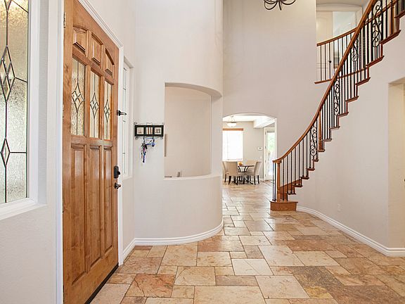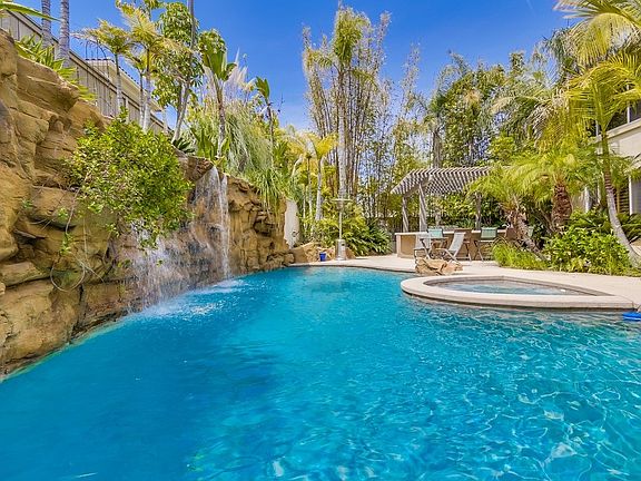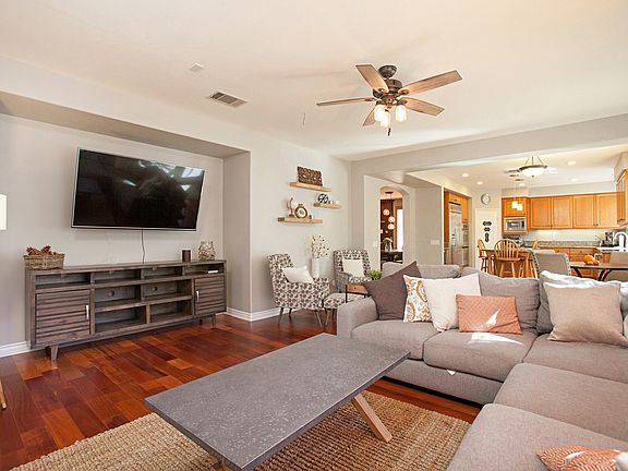 A stunning masterpiece with all the bells & whistles! Grand entry high ceilings, wrought-iron stairs, Versailles pattern tile & eng hardwood floors. Second story has Master suite with dedicated office, extra large closet room & spa like bath! +1 bonus room & secondary bedrooms each with its own bathroom! There is an additional 1 bedroom & 1 full bath down. Downstairs has separate formal & dining room with custom built-in display cabinets complete with under mount lighting. Great Room floor plan with gourmet chef's kitchen, granite counter tops, stainless steel appliances, pantry & large island! Custom built-ins continue in the family room which also features cozy fireplace & french doors leading to your gorgeous private oasis! A true entertainers' dream with sparking pool, beautiful accent rock waterfall wall, large hot tub & fully decked out outdoor kitchen w/ eat-at bar!
