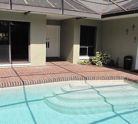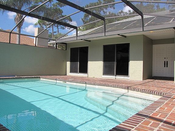 WOW!! Golf front beauty with courtyard pool!! This home has a spacious, fully updated kitchen that opens out to the screen enclosed solar heated pool and deck area. There is ceramic tile flooring throughout. Fireplace in Living Room. Master Bedroom has additional room for office, hobby, exercise. Third bedroom has a built-in shelving unit instead of closet so can be used as formal dining room or easy to install a closet. Enclosed rear porch with wet bar overlooks the Sweetwater golf course. Two-car garage has separate golf cart door and parking area. All of this with very low maintenance fees and walking distance to country club. Roof replaced in 2008, windows in 2012.