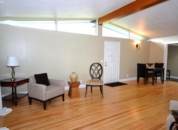 Gorgeous hardwood floors, and modern colors throughout. Soaring vaulted ceilings. Exposed wood beam in living room. Ceiling to floor brick fireplace. Nook space with tasteful tile flooring and skylights. Dishwasher, eat area, clean white cupboards, and tile back splash in kitchen. Large closets in all bedrooms. Private bath in master suite. Fenced yard and RV parking. Located minutes from I-84 and I-205. This is the perfect ranch home!