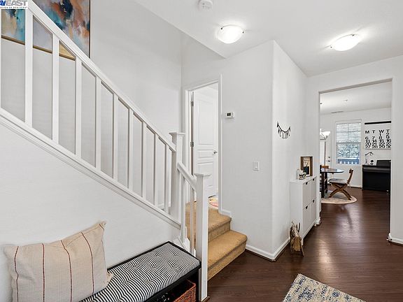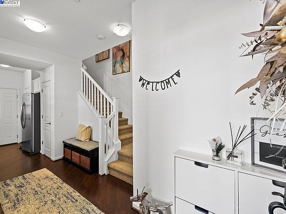 Welcome to this charming and elegant townhouse-style condo in the Crossings at Eden Shores Community! This East facing end unit is filled with natural sunlight, meticulously maintained and looks like new. The spacious formal living and dining combine has a private balcony, while the spacious kitchen is loaded with high end SS appliances with gas range, granite counter top, newly painted cabinet, nook area and pantry. Master suite has two walk-in closets with organizers and master bath has double vanities, bathtub, and glass shower. Other special features: beautiful top grade laminate flooring on main level, designer carpet on upper level, built-in fireplace, double pane windows, laundry room, recess lighting, loft area with desk and much more. Close to many amenities - playground, Alden E. Oliver Sports Park, groceries, walks to Costco and other shops. Easy access to I-880/92.