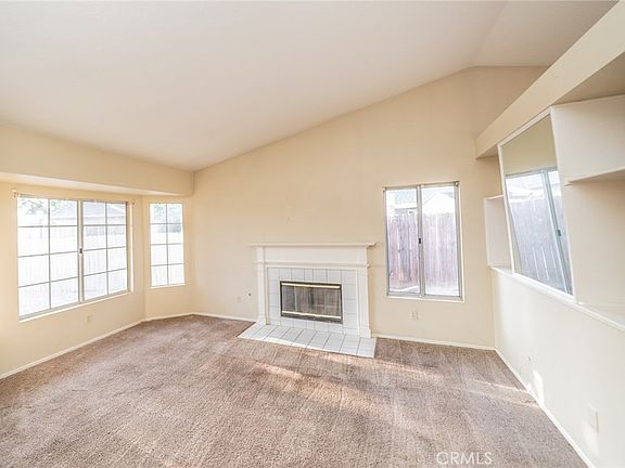 Welcome to this single-story 3-bedroom, 2-bath home in Perris. You are greeted with a covered front porch. Upon entry, the open floor plan has vaulted ceilings throughout. The front is a living room with a fireplace, followed by the family room and wide open to the kitchen with stone paver flooring and an island. The primary bedroom has an ensuite bath with dual sinks and a makeup counter between, and with a walk-in shower. Two bedrooms share a secondary bathroom with a tub/shower combo. The front yard has rock landscape, and the backyard has block walls and a large cement patio. Low taxes and no HOA keep your payments low.