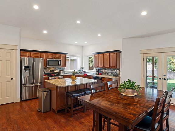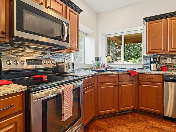 You will love this impeccable single-level home with a beautiful open concept entertainer's kitchen -- granite countertops, island with bar seating, large pantry storage, vaulted ceilings, and gas fireplace in living area. The roomy master suite features walk-in closet, double vanity, soaker tub, separate shower, and access out back. The large established backyard provides the very best of Idaho sunsets enjoyed from the spacious covered patio for endless outdoor entertaining. New exterior and interior paint. New shed with sun porch. 3 car garage boasts epoxy flooring and workbenches (included). RV parking. New roof in 2017; new HVAC in 2020. Location is everything in this quiet and walkable neighborhood with easy access to restaurants, shopping and freeway.