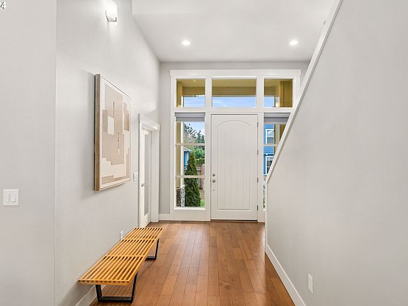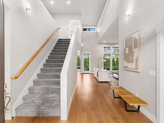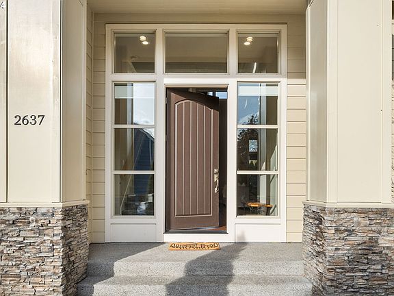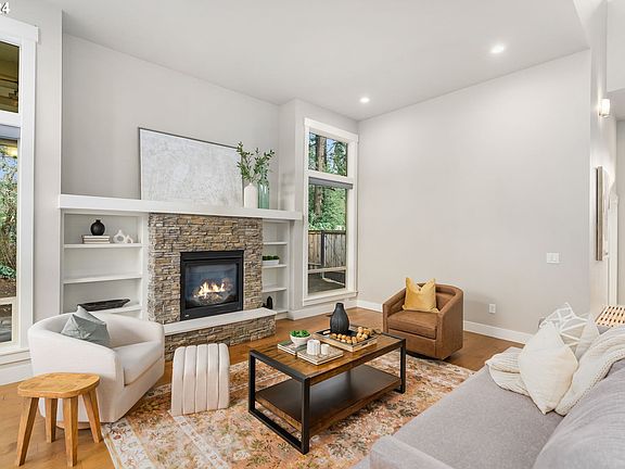 This impeccable contemporary prairie home is situated at the end of a private road nestled amongst evergreens. The front yard is beautifully manicured and easily maintained. As you enter the home through a stately 9' entry door you are met with a large open foyer, 20' ceilings and wood floors throughout. A light filled office with glass French doors is to the right. Floor to ceiling windows keep this house filled with natural light even on our cloudiest days. As you enter the main living space you are met with a chefs kitchen and large living room. In the kitchen you will find newer stainless steel appliances, large island, quartz countertops and butlers pantry with room for a secondary refrigerator. To make this great room even better a gas fireplace with stone surround and built in shelving accent the opposing wall. The upper level consists of a primary bedroom with ensuite, large walk in closet, private water closet and large walk in shower. On this level you will also find a conveniently located laundry room, two more bedrooms and a shared split bathroom. Back downstairs and through the kitchen a full glass door leads to a private back yard retreat. Fully fenced, with a lush arborvitae hedge. The synthetic turf and professional landscaping make this a low maintenance space. Just sit back and enjoy the expansive covered patio which includes a hot tub hook up, 2 powerful heat lamps, ceiling fan, tv mount and endless possibilities. Not only is this home a stunner inside and out, the surrounding neighborhood has so much to offer.