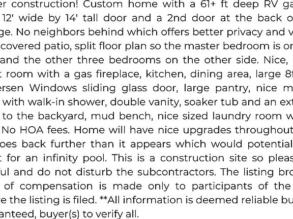 Under construction! Custom home with a 61+ ft deep RV garage with 12' wide by 14' tall door and a 2nd door at the back of the garage. No neighbors behind which offers better privacy and views. Nice covered patio, split floor plan so the master bedroom is on one side and the other three bedrooms on the other side. Nice, open great room with a gas fireplace, kitchen, dining area, large 8ft tall Andersen Windows sliding glass door, large pantry, nice master suite with walk-in shower, double vanity, soaker tub and an exterior door to the backyard, mud bench, nice sized laundry room with a sink. No HOA fees. Home will have nice upgrades throughout. The lot goes back further than it appears which would potentially be great for an infinity pool. This is a construction site so please be careful and do not disturb the subcontractors. The listing broker's offer of compensation is made only to participants of the MLS where the listing is filed. **All information is deemed reliable but not guaranteed, buyer(s) to verify all.