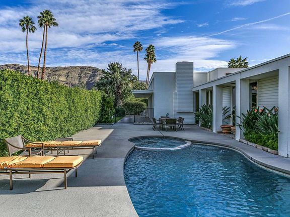 A truly rare opportunity to own one of 44 Mid-Century styled homes by architect William Krisel at Kings Point in south Palm Springs! This one of the largest and one of two built for the original community developer at 2899 SF. Views face both north to mountains and the Indian Canyon North golf fairways along with a private pool & spa facing all of the west/southwest mountain behind walls & hedges. Upon entry, you find an enormous living space with original Terrazzo floors, sunken living area, 14' ceilings, clerestory windows and large dining area, fireplace & TV lounge. The updated kitchen is fantastic with loads of storage. Also one of the very few homes with 3 full bathrooms plus Powder Room. This home exemplifies the most sought after Palm Springs lifestyle. Walls of glass create an airy, open environment bringing the beauty of the golf course greens and mountains indoors. The wrap around patio allows for the very best views available in this small 44 home community. In addition to the private pool & spa, Kings Point also offers privacy, 2 community pools, N/S tennis courts and small clubhouse. These well known William Kirsel homes come available rarely. Now is your chance to grab one of the finest built!