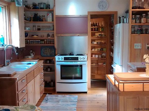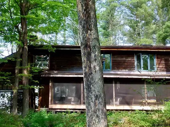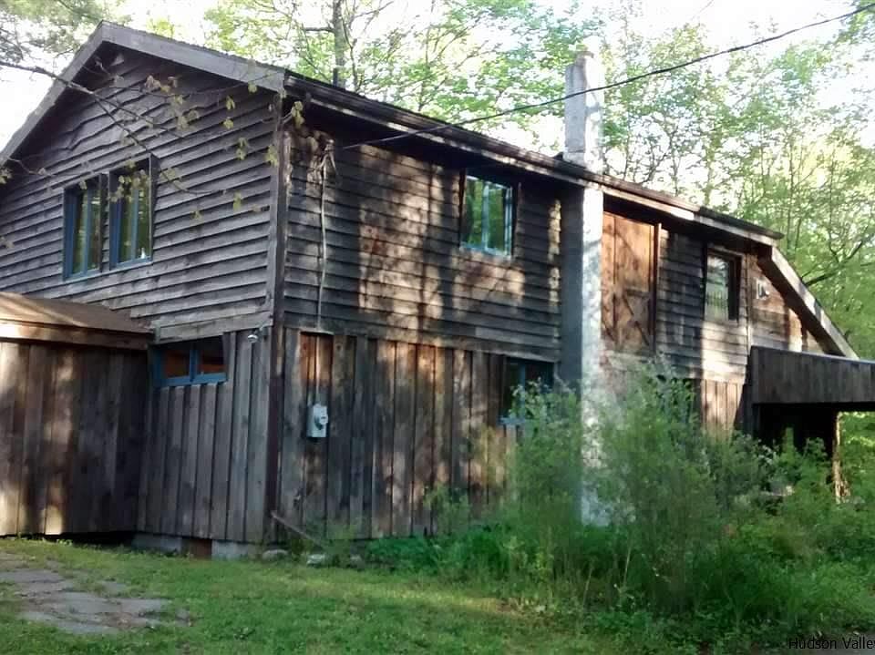 Hand built Contemporary in a private cliff-top setting. Enjoy your morning beverage overlooking 30+ acres including a large organic garden and woods. Watch the seasons change as the forest and mature plantings blossom and perfume the air. Built in the tradition of the Woodstock handcrafted one-of-a-kind home, this contemporary features custom woodwork from trees harvested and milled locally with sustainable methods. The cathedral two story open floor plan has traditionally hand hewn 8"x8" post and beam construction with antique stained glass windows, built in floor-to-ceiling bookcase, balconies and a 26' greenhouse. An island of wood and marble separates the custom kitchen from the soaring 20 ft ceilings and the fieldstone fireplace. The master bedroom has a large operating skylight, full bath and walk-in closet. A large loft space is suitable for a guest room, third bedroom or an office. The screened porch has two large skylights and a country "summer kitchen" with vintage porcelain sinks. The porch, perched on a 20-foot cliff, overlooks the 1-acre organic flower and vegetable garden, orchard and lawn. The 1940 square foot home was built in 1974 and the roof was redone 4+ years ago with 30-year architectural grade shingles. There is a one-and-a-half story garden shed and a storage structure which overlooks the garden could make a sweet studio/workshop space. 22.4 acres are protected by a NYSDEP conservation easement insuring the land will not be developed. The 2.60 acre house lot has one acre residential zoning leaving open the option for a studio or even a guest house. There is also a 7 ac lot that could be developed.