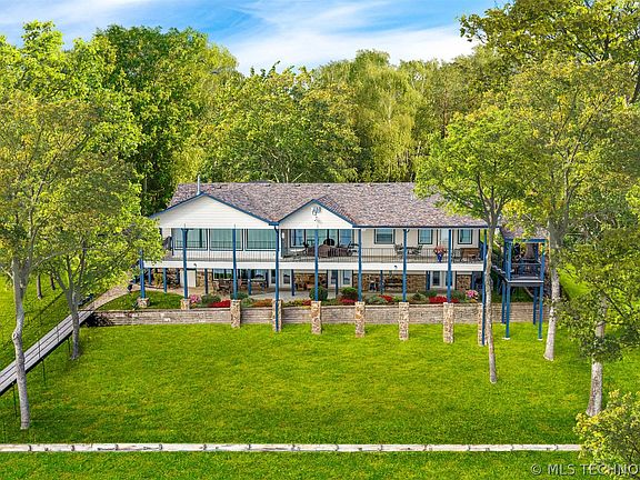 Situated on ¾ acre, this newly remodeled home from the studs out has an unparalleled view of Grand Lake from all main rooms and bedrooms. The 1st floor contains a master suite with his and hers closets and an elegant bathroom with a dual soaking tub. The vaulted great room, with its fireplace and gourmet kitchen, opens onto a formal dining room and covered deck, making it a beautiful space for entertaining. The lower level contains 3 bedrooms, 1 bathroom, a flex room, and a living room with a bar and fireplace. Picture windows and French doors overlook a patio with an unequaled view of the water. Other features include a 4-car garage, with an office and a storage room, and a boat dock with 2 slips and a fishing room.