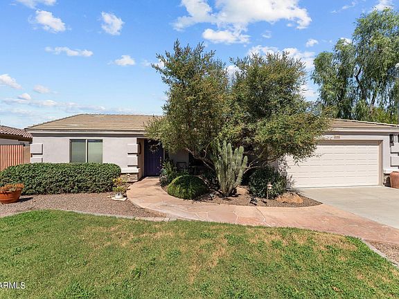 Grass, front and back. Small pond surrounded by mature landscaping, including fruit trees. Block wall surrounds the backyard for lots of privacy.