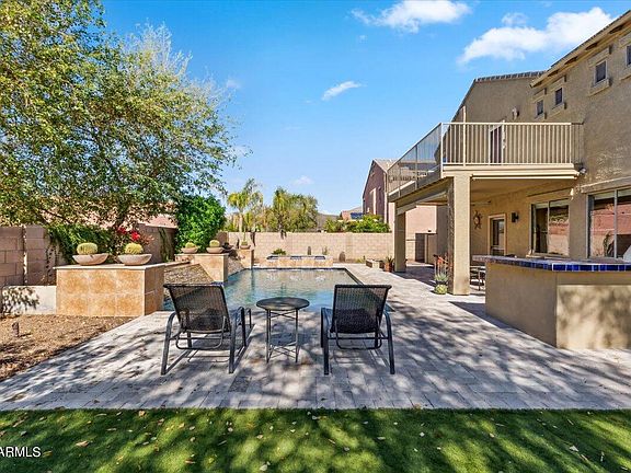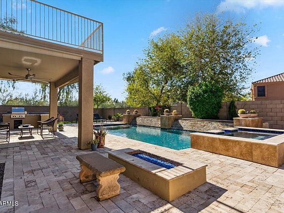 Welcome to your remodeled contemporary dream home w/ luxury features on a corner lot and across the street from a neighborhood common area. Relax in your RESORT BACKYARD w/ heated pool, spa, views, firepit, and barbecue. Inside, enjoy the remodeled elegance w/ an open floor plan, a stacked stone fireplace, and a 2-story Great room. The gourmet kitchen features S/S appliances, center island, and a serving island, all open to the Great room. Other features include a formal Dining Rm, courtyard, highly upgraded remodeled baths, and a primary bedroom retreat featuring a large private balcony. All are located in the desired neighborhood of Desert Peak, just minutes away from Desert Ridge Mall, City North, easy hwy access, golf, restaurants, schools, Costco, and more. Solar panels owned.