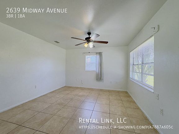Located at 2639 Midway Avenue, this affordable 3-bedroom, 1-bathroom home offers practical living in a convenient Fort Myers location. The home features easy-to-maintain tile flooring throughout, ceiling fans in the main areas to keep things cool, and the rent includes yard maintenance and trash collectionmaking it an even more budget-friendly option. The area around 2639 Midway Avenue is perfect for those seeking everyday conveniences. It's close to major roadways, providing quick access to downtown Fort Myers, shopping centers, local dining options, and nearby parks. You'll be just a short drive from the beautiful Gulf Coast beaches and the Caloosahatchee River for those who enjoy outdoor activities. This home offers a simple, comfortable space in a well-connected neighborhood. Don't miss out on this great rental opportunity! Included with the advertised rent amount, experience the ultimate in convenience with the Rental Link Resident Benefits Package (RBP). Enjoy peace of mind with renters insurance, breathe easy with regular HVAC air filter deliveries (where applicable), and watch your credit score soar with our credit-building program for timely rent payments. Benefit from $1M Identity Coverage and let our move-in concierge service take the hassle out of connecting utilities and setting up home services. Plus, indulge in our top-tier resident rewards program and so much more! Discover all the benefits upon application.