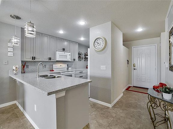 You will fall in love with every detail of this gorgeous first floor condominium in Lakefront at Deep Creek. Soak in the expansive sparkling lake and pool views from your delightful screened in lanai. This residence with two bedrooms and a den has been beautifully updated. The kitchen features new countertops and custom soft-close built-in drawers. To top it all off, this completely furnished unit boasts new matching countertops and sinks in both baths, volume 9-foot ceilings in the main living area, immaculate tile flooring throughout, impact-resistant windows, an impact-resistant front storm door, a 2023 water heater, a designated carport space, ample guest parking and a sizeable exterior storage closet. You will be near the condominium pool and a two-minute distance to Deep Creek Golf Club, a delightful course open to the public. This is arguably one of the most desirable condominium buildings in all of Deep Creek and is near Charlotte Harbor, Peace River, Fisherman’s Village shops and restaurants, airboat rides, kayaking, and multiple exquisite restaurants and entertainment.