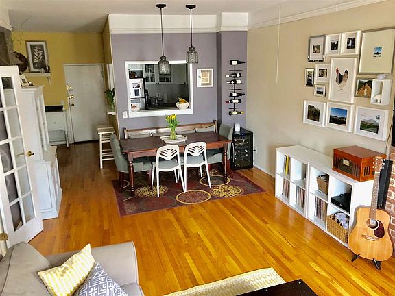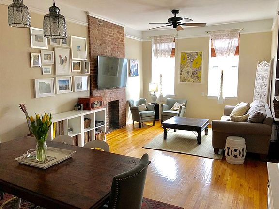Don't miss the opportunity to live in this sun-drenched, south facing home, overlooking beautiful Historic Hamilton Park. Enjoy an airy and spacious feel with tons of closet space in this 2 bedroom/1.5 bathroom unit. Recently renovated kitchen featuring stainless steel appliances, designer cabinetry, quartz counter tops and a breakfast bar. Charming details include oak hardwood floors, exposed brick chimney, high ceilings with crown molding, French doors and floor to ceiling "built-in" bookshelves for extra storage and added character. Open layout includes an entrance foyer and a comfortable dining area, flowing into the living room. A large master bedroom with an ensuite half bathroom. Renovated full bathroom with brushed nickel Kohler hardware and deep soaking tub. This home also features a deeded and gated 1 car parking space and is conveniently located within a 10 minute walk to either the Newport or Grove Street Path Train, #126 Bus, Ferry or Light Rail. Just minutes from the Holland Tunnel, NJ Turnpike & Interstate highways. And just steps to local Downtown restaurants, shopping and Nightlife. Newly renovated common area including lobby, hallways, laundry room, 2 elevators, secured mail/package room, phone-synced intercom and brand new storage lockers. "Live In" Super helps keep the building in tip top shape. Well stocked gym and bike room round out numerous amenities.