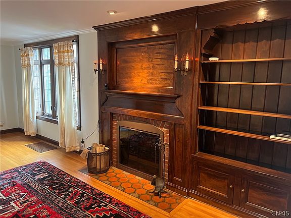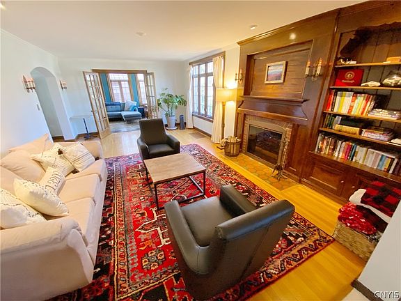 Nestled in Syracuse's charming Sedgwick neighborhood, this 4-bedroom, 2.5-bathroom tudor-style house blends timeless elegance with modern comforts! Spanning 2610 sq. ft., this home features exquisite woodwork, hardwood floors, and a layout that honors its historical roots, with unique candle accents designed specifically for the first owners when the home was designed and built by noted architect Paul Heuber in 1925. Highlights include a cozy living room with a wood-burning fireplace and built-in shelving, a spacious dining room with new chandelier, and a sunroom that opens to a tranquil patio and fenced in yard. The kitchen boasts oak cabinets and stainless steel appliances. Upstairs, find spacious bedrooms and bathrooms with original tiling, plus a partially finished third floor ready for transformation. This property offers a blend of privacy and community spirit, making it a perfect sanctuary in the heart of Syracuse. Showings begin 3/27/24 @ 8AM.