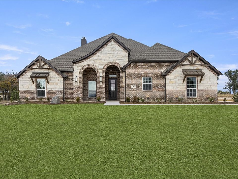 MLS# 20073271 - Built by Brookson Builders - Ready Now! ~ The exterior features brick and stone, metal roof accents, and a swoop above the porch. As you enter the front door you're welcomed by the study’s barn doors and an accented wall. Do you need a 4th Bedroom instead? This study can be converted into a 4th Bedroom! Beyond the foyer an open living room that’s straight ahead. A key feature to this room is the floor-to-ceiling painted brick fireplace with a barnwood mantel, built-in cabinetry and floating shelves. Just feet away the kitchen awaits you. This includes custom-built glass-front cabinetry and decorative hardware. You will also see a wooden vent hood, decorative backsplash, pot filler, double ovens, quartz countertops, an island with decorative legs, and a custom hidden pantry. The nearby dining features a ship lapped wall. For all restrooms expect decorative plumbing fixtures, custom tile, and framed mirrors!