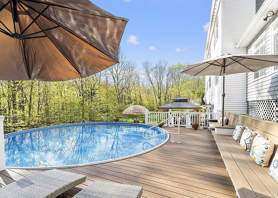 Just in time to enjoy your new SUMMER OASIS! This young 3+ bedroom, 3 bath Custom Cape is set back from the road on a private 2 acre lot. From the moment you pull into the driveway, you will feel at home! Featuring a welcoming covered porch, open layout, hardwood floors, kitchen with granite counters and stainless steel appliances, dining room with bow window, living room with wood burning fireplace insert, home office, stunning sun room leading out to the deck and yard, full bath with laundry on the main level. Upstairs there are 3 good sized bedrooms and a full bath with double sinks. The main bedroom boasts vaulted ceilings and a walk in closet with barn door. The walk out finished lower level has a family/game room, kitchenette, bonus room, and half bath. Step outside to view the AWESOME yard complete with above ground pool, oversized deck, patio, shed and fire pit area. This home has been tastefully updated and is move in ready!