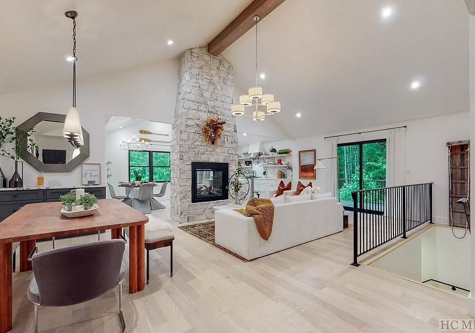 Don't miss this newly renovated home just 5 minutes from Main Street in Highlands NC. Everything in this home is new; new roof, new floors, new HVAC, new kitchen, new bathrooms, new paint, new decks, new lighting, new landscaping, everything. With a luxuriously modern yet comfortable design & high-end finishes, this property is move-in ready. Located at the end of a quiet residential street, this home feels like a sanctuary. Enjoy the peaceful sounds of nature while sipping a glass of wine on the front deck or settle in with a good book on the porch swing on a lazy afternoon. Enter the front door and you are immediately welcomed by an open living space with beautiful wood flooring, vaulted ceilings, light fixtures from Circa & a new stone fireplace that fronts both the living room and the kitchen for that touch of warmth on cool mountain evenings. The dining area is open to the living room and features a custom built-in bar for entertaining. The stunning kitchen is a home chef's dream with custom cabinetry, open shelving, stainless steel appliances, & gorgeous marble countertops imported from Italy. Skylights over the island flood the space with natural light making it feel bright & airy. With three bedrooms & two full baths on the main level, this home is perfect for a family or to host visitors for a stay in the mountains. The two baths have been fully updated and feature handmade tiles from Spain, modern light fixtures & custom vanities with soapstone tops. If that was not enough, this home features a lower level accessible by a staircase or the elevator! Downstairs you will find space for an office or home gym, a half bath, another family room perfect for movie night, a laundry closet, abundant storage plus a one-car garage. Price does not include the furniture but all furniture and furnishings may be purchased separately.