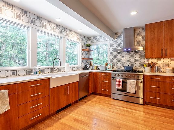 This Mid-Century Modern 4BR, 3.5BA home is situated in the Conantum neighborhood, one of Massachusetts' first planned communities. Features include vaulted ceilings, solid oak hardwood floors, and custom mid-century modern cherry cabinetry. Stunning kitchen with stainless steel appliances, custom farmhouse sink, and oversized white quartz kitchen island. Kitchen opens in two directions to sunny, fireplaced family room and to dining room. Natural light fills the home through thoughtfully designed windows with custom shades. All baths feature designer finishes including wallpaper, lighting, subway tile, quartz countertops, and tile flooring. Wooded lot offers both privacy and beauty. Private trail access from backyard leads to walking trails and neighborhood sledding hill. A second patio is perfect for gathering around a fire pit with friends. Enjoy all the amenities Conantum offers: kayaking, neighborhood events, sledding, hiking trails, a community garden, tennis courts.