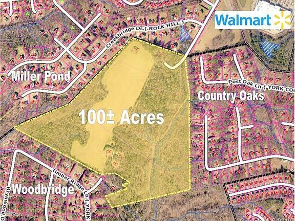 100± acres of prime residential development land, zoned RD-I in York County. Several businesses and restaurants, including Walmart Super Center, Dollar Tree, Founders, Empire Pizza, Charanda already in the area and more are on the way. Residential neighborhoods (Miller Pond, Country Oaks, and Woodbridge) bordering the property. Country setting with convenience to City. Proximity to great schools, shopping and dining makes this a great location, ideal for subdivision. The property has a relatively flat topo and is currently wooded, with 22± acres of farmland cleared. USDA soil survey shows mostly cecil sandy clay loam. 2017 USDOT shows 29,600 VPD traffic count on Old York Road at Walmart. Water line is on Miller Pond road and other utilities are close by. Located approximately 6 miles from I-77 for quick commute to Charlotte, NC.