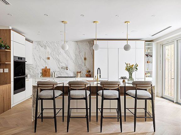 Calacatta Gold slab marble feature wall and matching waterfall-edge central island, the open kitchen, also on the parlor floor, is as striking as it is functional. Sleek cabinetry is by luxury German manufacturer Nolte Küchen, chef-caliber appliances are by Dacor, and sink fixtures are by Dornbracht.