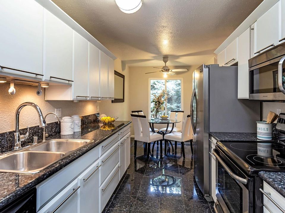 Tranquil gardens and greenbelt views surround this two bedroom updated and spacious condo. Upper level unit in the most ideal, secluded and serene location of the complex. Beautifully updated with granite kitchen, updated appliances, new carpet and fresh paint. Pool with solar heating and a kid's playground on site. Conveniently located near Shoreline Park Recreational Area, Stevens Creek Trail, Downtown Mt. View, freeways and all of the large tech companies. An incredible value and opportunity.
