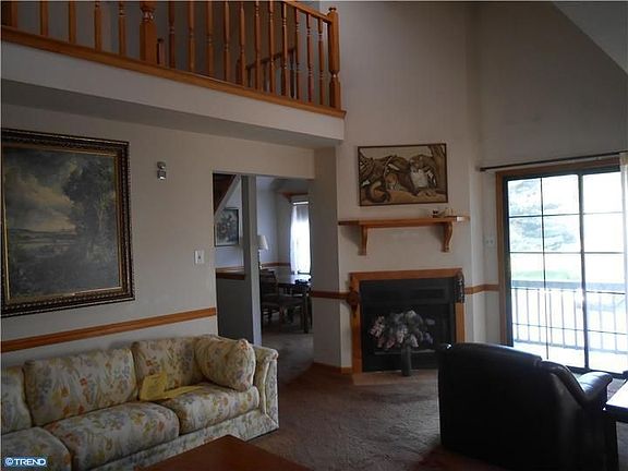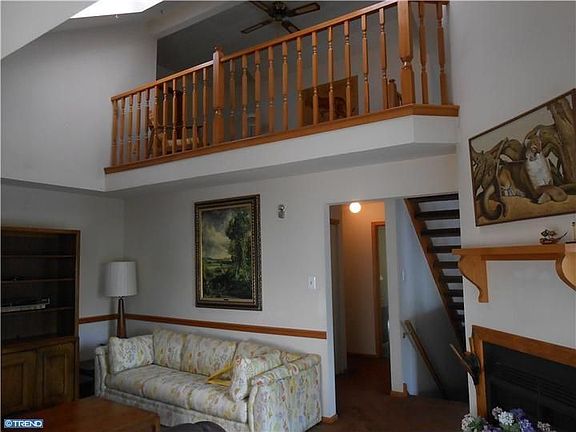 2 bedroom/2 full bath "END UNIT" backing to mature trees offers a large living room/great room with cathedral ceiling, skylights & wood burning fireplace. Foyer entry w/tile floor & coat closet, formal dining room with cathedral ceiling & ceiling fan. Large eat in kitchen with oak cabinetry, pantry & built in microwave above stove. Two large bedrooms (main bedroom with private bath) in addition to large loft with skylights that could be used as a 3rd bedroom if so desired. ALL bedrooms including loft have very large walk-in closets. Second floor deck with entry from 2 sliders (one off living room & one off dining room) & storage/utility closet. Wooden chair rails throughout most of the home in addition to built in shelving along upper walls in several locations & an abundance of closet space. Wonderful setting in rear of street (very last unit). One year home warranty provided by seller with acceptable offer.