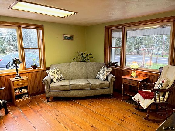 Great location on Rte. 49 in Constantia.  Home was a restaurant and has been converted to a single-family home.  Newer furnace & hot water tank with lots of updated plumbing.  This House has many unique features.  Stained glass windows, large wood plank floors throughout, and beautiful hand carved wood trim in the dining room.  The entire house has a hard-wired fire alarm system.  A very large horse barn sits to the back of this property with six stalls, lots of storage and a loft space.  this barn is open to so many possibilities.  A chicken coop is located in a section of the barn with access to a fenced in outside area for the chickens to run around.  RV electrical hookups are also located on the property.  Year-round stream flowing on the side of the yard.  The options are limitless.  Bring your creative ideas to this unique property.