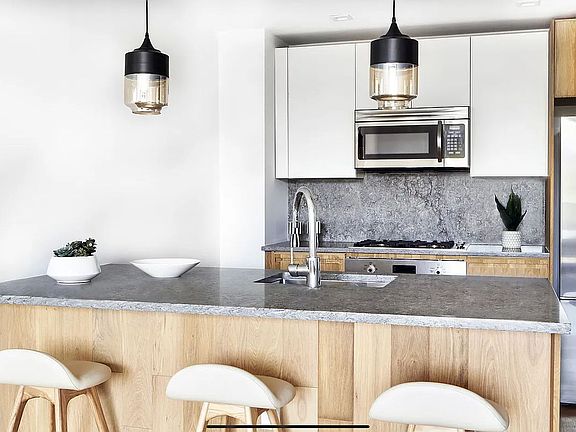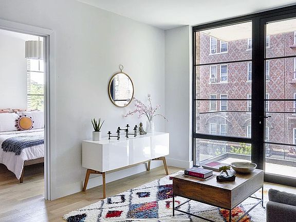 Massive 1 bedroom plus separate home office offers many options. This big bright home faces south, has a balcony, great closet space in a full service luxury new building. Inspired by the classical architecture of the Prospect Park Boathouse, 264 Webster is a luxurious new arrival in Kensington. The residences have been designed with meaningful details, from oversized industrial-style windows to wide-plank oak flooring throughout.. The kitchens feature Symphony Gray Caesarstone countertops and backsplashes, white matte lacquer and white oak cabinetry and a suite of premium, stainless steel appliances. Master bathrooms feature honed Carrara large format marble walls and hexagonal pattern flooring, carried into the glass-enclosed shower. The secondary baths have unique white textured ceramic subway tiles, gray porcelain floor tile, and a deep soaking tub. Live indoors and out with 264 Webster's suite of serene amenities. A double-height lobby features a part-time attendant or virtual doorman for all your needs. The Library features comfortable seating for working from home, while the Residents' Lounge is complete with a wet bar and billiards table. The fitness center is outfitted with top-of-the-line equipment and window into the engaging children's playroom. Host dinner on the roof terrace with views of Brooklyn and beyond, outdoor kitchen, and dining area. Additional amenities include a pet spa, bike storage, and private storage. Parking is available.