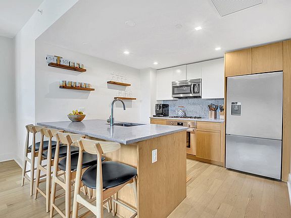 Built in 2018, 264 Webster offers more than you might expect. Enter a double-height, 24-hour attended lobby, with a well-appointed library to one side. The residents’ lounge has a wet bar and billiards table. The fitness center is outfitted with top-of-the-line equipment, and the children’s playroom is right next door. The beautiful roof deck boasts an outdoor kitchen with space for dining. Additional amenities include a super, pet spa, free bike storage, moped parking, and laundry room.