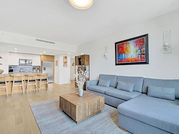 The apartment boasts oversized double pane windows, motorized shades, wide plank oak flooring, LG HVAC system, ample closet space, and a stacked Bosch washer/dryer. The kitchen features a Fisher & Paykel fridge, Bertazzoni gas range, and Blomberg dishwasher, symphony gray quartz countertops, and white oak cabinetry. One bathroom is equipped with a deep soaking tub while the other has a walk-in shower.