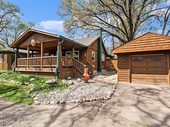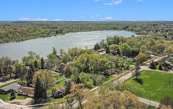 Year-round cottage life; up-north, lake-living, in town! It's the vacation-at-home lifestyle you've been looking for! Tailgate in the fenced backyard with a big patio, outside kitchen setup and professional turf for rough-housing. Stormy weather? Move the party into the boat garage converted to a speakeasy. All wired for music speakers too! The covered front porch will be everyone's favorite hangout. Stroll to the private Hickory Hills Association sandy beach front, playground, and boat launch with dock. Great four bedroom, two bath layout has space for everyone, including a primary ensuite. Eat-in-kitchen with cathedral ceilings, granite countertops, incredible tile floor, loads of storage, and a secret loft! Snuggle up on chilly evenings in the big living room with a stone fireplace and french doors to your front yard. Access loads of state parks, trail runs, and camping within just a mile, and the Hickory Hills golf club around the block. Set yourself up in a hammock gazing into the ginormous branches of the old oak tree, which is also home to a cute flying squirrel. It's the four season, vacation-at-home lifestyle you've been looking for!