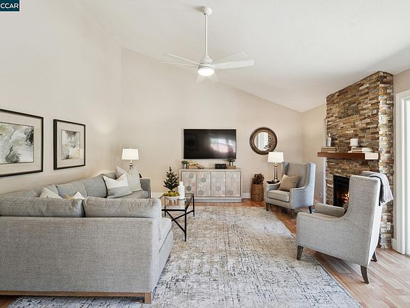 Situated in the Meadow Glen neighborhood, this level-in single story end unit features 2 bedrooms and 2 bathrooms. Accentuated by vaulted ceilings and hardwood flooring, the family room boasts a stacked stone fireplace, ceiling fan and a sliding glass door to access the backyard. Adjacent to the dining area with another sliding glass door leading to the patio, the kitchen offers a breakfast bar and stainless steel appliances. The primary bedroom showcases a large walk-in closet, access to an additional enclosed patio and updated ensuite bathroom with a marble top vanity. Across the hall, there is a secondary bedroom and an updated hall bathroom. There is an outdoor enclosed space ideal for an office complete with electricity. The fully fenced backyard has an oversized flagstone patio and lush landscaping. More highlights include two deeded covered carports with storage and indoor laundry. HOA amenities include a community pool, clubhouse and guest parking. This townhome is conveniently located near shopping centers, 680 FWY access and top rated schools. HOA fee is $475/month.