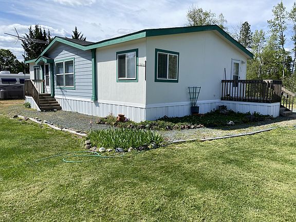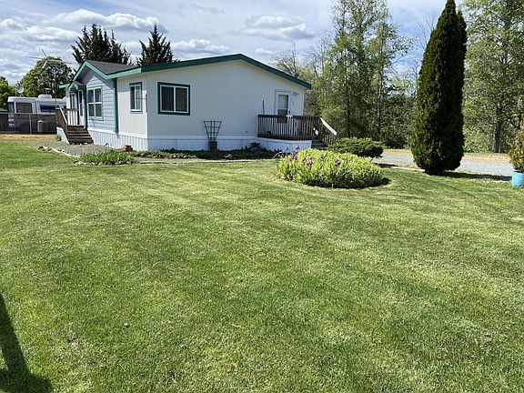 Beautifully maintained manufactured home on huge space in a manufactured home park with manicured lawn, strawberry garden and a creek flowing by. Split floorplan with spacious master on one side and two more bedrooms and a bathroom on the other. Open kitchen/living room area with front deck and side deck leading into the laundry room. Space rent is $700/month and includes water/sewer. There is also space for a small RV and a nice little storage shed too!