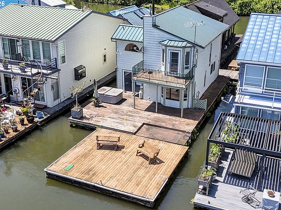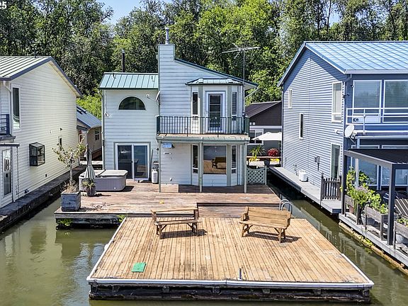 Here is your chance to buy into ownership at Wapato Moorage on the front facing row! What makes Wapato so unique is the slips on the front are 80 feet out. Yes, EIGHTY. (As a comparison most moorages are 55-60 feet out.) What also makes Wapato such an outlier is that it is a 32 acre gated property, with garden boxes, fire pit area, fruit trees, and room to toss a ball for your dog. When you first turn off the road onto the property you’ll feel the workday fading away and the vast green grounds bringing a promise of peace and adventure all at the same time. Enjoy sweeping views of the Multnomah Channel and Sauvie Island. Sunrises are spectacular flanked by "3 mountain days" featuring St Helens, Hood, and Adams. The deck space is the real superstar of this home. There is a covered section, a hot tub, a recessed area, an enormous swim float, and a space on the side for mooring your boat. The current deck is not taking up the allowed 80’ of space. You could build a new swim float and incorporate a hydrohoist/boat slip and a kayak step down - the possibilities are endless! The layout is open concept with a warm and cozy propane fireplace and a charming bay window. Imagine preparing dinner while looking out at the river or chatting with your guests at the eating bar. The primary bedroom layout is fantastic with vaulted ceilings, a balcony, ensuite bathroom and secret closet in a closet. There is a door in the closet leading to attic space for tons of storage. The secondary deck has its own balcony as well. So no matter where the sun is, you have a place to sit outside! Why pay top dollar for someone else's design choices when you can scoop up this house and remodel exactly how you'd like? This is a rare find. Solid float, rated a 3 in Sept 2024. Brand new interior paint in the living/kitchen area, stairs, and in the second bedroom. Included in the sale is membership in the corporation, Wapato Moorage Association.
