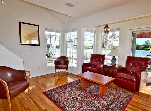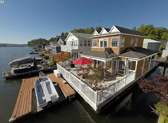 Super sharp, clean & move in ready home w/ gleaming hardwood floors on main, tile in kit & bathrooms. Master suite upstairs w/ full bath & balcony. Large deck in front & swim float on river side to enjoy views of the river, island & mountains! $45K lease fee to moorage incl in price - acts as credit upon future resale (extra asset).Great float w/ report avail (rated 4+ of 5).Furnishings negotiable.