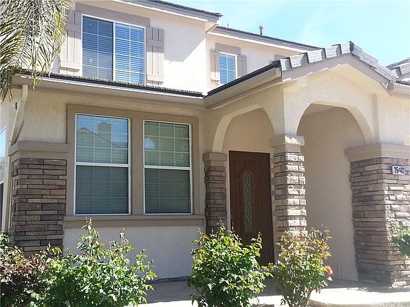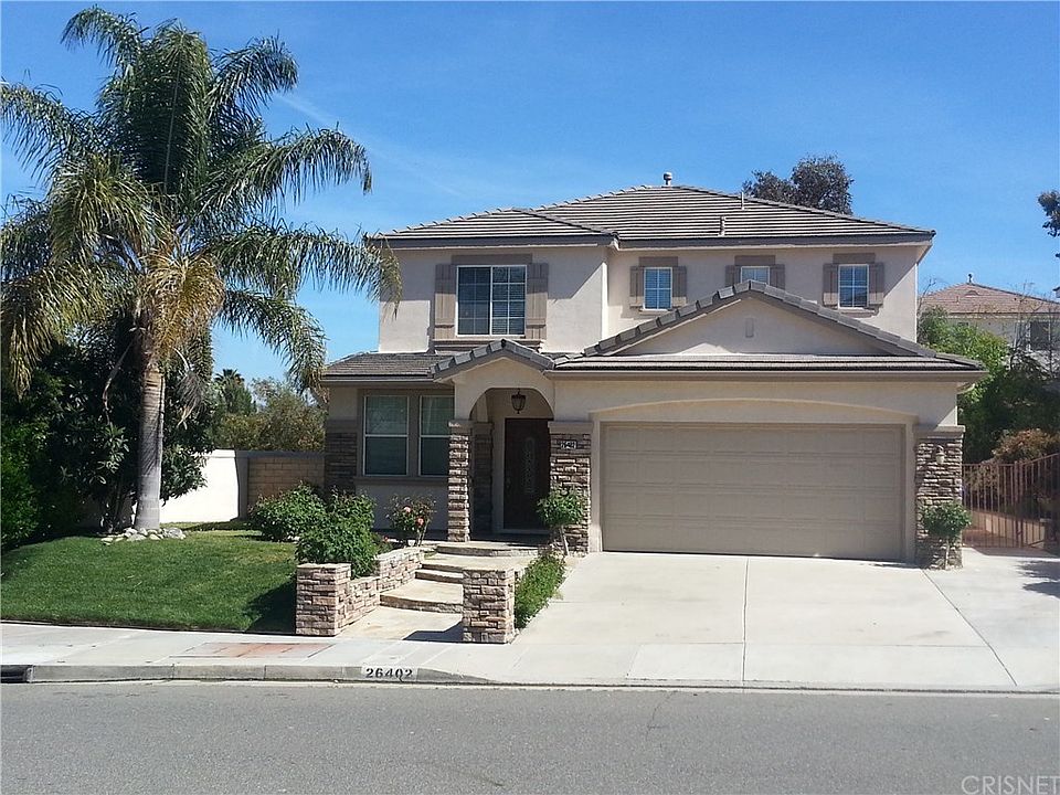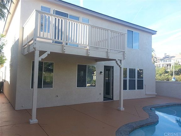 A Beautiful pool home located in a desirable area of Stevenson Ranch, near schools, shops and restaurants. This home features 5 bedrooms and 3 bathrooms and is 2,603 sq. ft., Fully upgraded kitchen, dining/living room combination and has been upgraded throughout with tile flooring, granite counters, laminate flooring upstairs, and wrought iron staircase, stone fireplace in family, warm paint colors throughout. Master bath features stone travertine shower, tub and slab vanities with a big walk-in closet. This home also features a swimming pool ideal for entertaining and enjoyment.