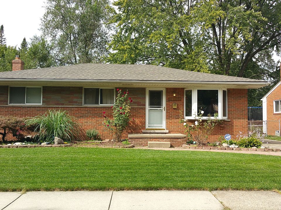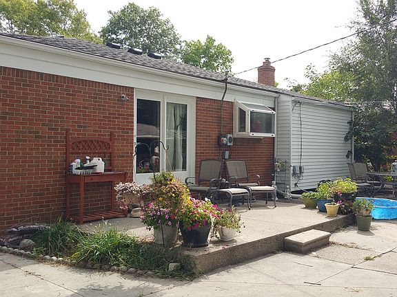 Amazing potential inside this brick single story home! Large living room with bay window, kitchen with custom wood cabinets, slate tile kitchen floor, generous eating space with garden window and glass door wall to fenced backyard. Ceramic tiled bath with double vanities and neutral decor, hardwood floors throughout the living room, hall, and bedroom #1. Full basement with bar area, laundry room, partially studded for your finishing touches. Detached 2 car garage. Roof on home and garage new in 2015 (tear off), home has additional blown insulation. 1/2 bath off kitchen needs updating. All appliances stay!!!