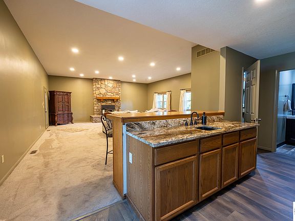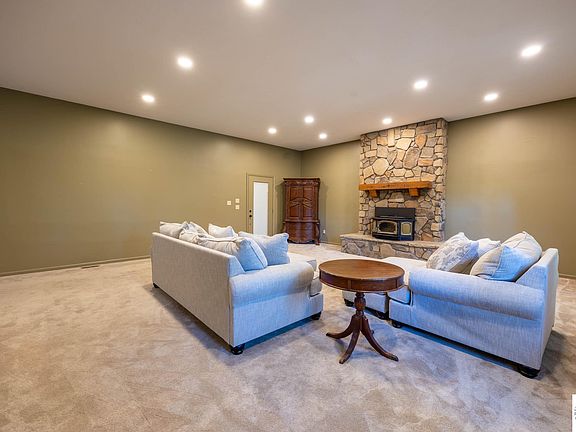 A beautiful and spacious 5 BR, 2 1/2 BA home with large rooms, full finished walkout basement and two detached garages. The main foyer gives you lots of room to take off your shoes before you enter the expansive living room with 10' ceilings, all newer recessed lighting, carpet, and windows throughout the home, with a partial lake view. A stone fireplace with an updated pellet stove insert, and bar seating make this a perfect area for entertaining guests! Transition into the kitchen with beautiful custom cabinets, granite countertops with a farm-style sink, walk-in pantry, and all newer black stainless-steel appliances. The huge master suite on the main level includes two closets, a master-bathroom with double-sinks, a jetted tub and beautiful tiled shower. Two additional bedrooms are on the main level along with a half-bath and laundry room. The lower level includes two additional bedrooms, a full bath, small kitchenette area, and a large rec room with electric fireplace. All this sits on 7+ acres, with 2 detached garages with electricity and concrete floors, storage shed, plenty of room for parking, and paved roads to the driveway! VERY well-maintained home. Watch video, or even better yet, come and take a look!