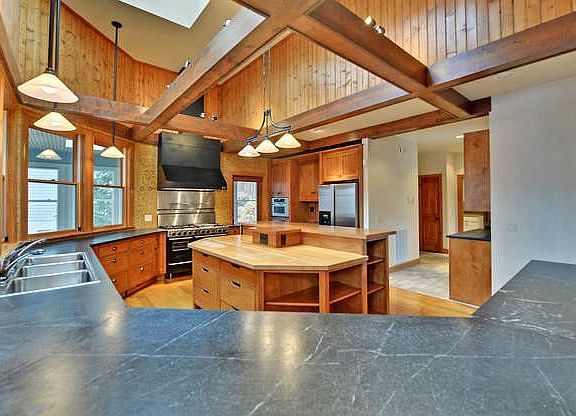 Craftsman style with unmatched quality & location! LAKEFRONT home with gorgeous hardwoods thru out the main & upper, beamed ceilings, stone fireplace & a perfect blend of materials! The interior woodwork is exceptional, the one of a kind kitchen offers soapstone & commercial appliances & anchors the large living area all with incredible mountain AND lake views! Separate dining, enormous porch, decks & fire pit all make entertaining a must! The terrace level with 2nd large living area, guest kitchen, exercise/hobby & large workshop! It's tough to find a window, and there are many, without a full lake, mountain or garden view on this gentle lot! Covered dock with swim deck, 2 car garage with dry walled bonus/media room above, storage at every turn! Truly a gem!