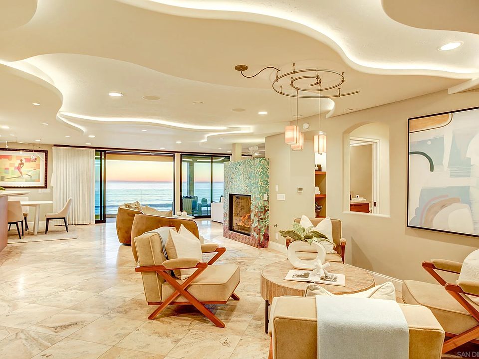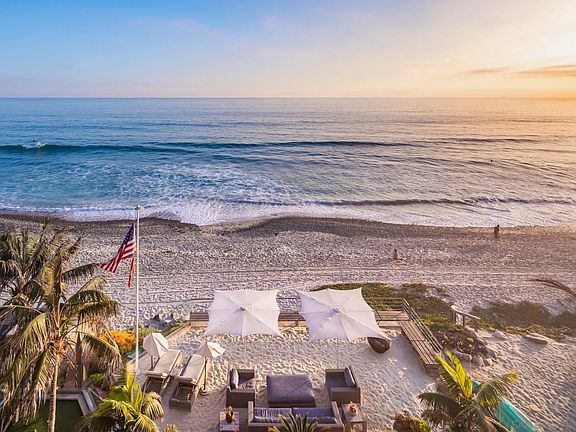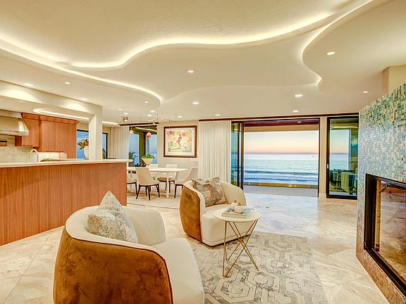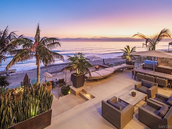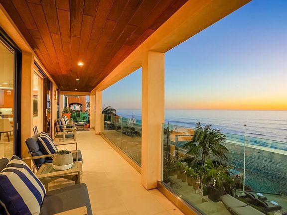 Oceanfront estate with panoramic water views directly on the sands of the most pristine stretch of beach in Carlsbad. 2641 Ocean Street, a beautifully designed 3 story home, with 5 bedrooms, 6 bathrooms and a separate one-bedroom downstairs guest suite sitting at nearly 6,200 sqft total. This home embodies a coastal design throughout, with state-of-the-art upgrades that take this residence to the next level. The entry level features a gourmet kitchen that includes Wolf and Subzero appliances, every element of this homes design defines luxury. An open floor plan with sliding glass doors to 3 patio areas allows for the ocean breeze to seamlessly spread throughout the home. Relax in the inviting living room with carved limestone fireplace and sliding wood and glass doors that open completely to the view deck, creating a large indoor/outdoor space. The spiral staircase & elevator provides access to all levels including the downstairs guest quarters. The upstairs level offers a Master suite with office/bedroom ensuite, stone fireplace and spacious walk-in closet. There are 3 additional bedrooms on this level as well as a home theater with an entertainment bar area. The private lower-level Guest Apartment includes a full kitchen with a walk out patio overlooking the Pacific Ocean. The highest-grade technology throughout including: Control4 smart home, commercial grade wifi & security. A spectacular backyard made for entertaining, with an outdoor kitchen, just steps away from the ocean water beautifully upgraded by Award Winning designer Wolfram Kalber.