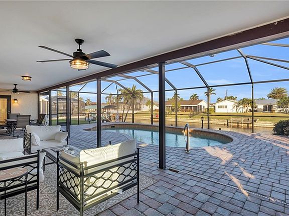 DIRECT GULF ACCESS POOL HOME! NEW ROOF (2023), NEW AC (2023), HURRICANE WINDOWS & NO WATER DAMAGE! This beautifully maintained 3-bedroom, 2-bathroom home offers 1623 square feet of thoughtfully designed living space. The freshly painted interior features luxury vinyl plank flooring throughout and a pristine kitchen with granite countertops, stainless steel appliances, subway tile backsplash and a breakfast bar. The generous primary suite offers ample space and includes a beautifully updated ensuite bathroom with a tiled, glass enclosed shower and plenty of cabinetry for storage. The outdoor living space is a true highlight, with an expansive new screened-in lanai, sparkling in-ground pool, and eastern rear exposure with stunning water front canal views. For boating enthusiasts, this prime location offers direct Gulf access, seconds to the river with no bridges—making it a boater's paradise! Conveniently located off of Veterans Pkwy and Del Prado Blvd, you’re just minutes away from all that Cape Coral has to offer including fine dining, shopping, and entertainment.