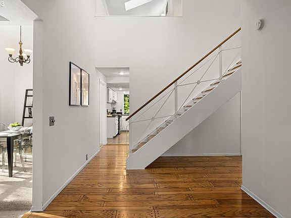 Indulge in the modern living in this contemporary home nestled on a tranquil cul-de-sac. Abundant skylights and vaulted ceilings with exposed beams showcase the ultimate openness. The elegance of the formal living room with gas fireplace and dining rooms sets the stage for treasured gatherings. In the family room, comfort and charm intertwine with a skylight, engineered hardwood floors, and an inviting gas fireplace. The well-appointed kitchen features granite countertops, stainless steel appliances, gas cooking, and a walk-in pantry. Retreat to the primary bedroom on main, a secluded haven accessible through double doors. A walk-in closet, double vanity, and another slider to the deck allow you to relax and enjoy the backyard. Upstairs, three generously sized bedrooms and an open loft offer versatility and space for everyone. Complete with a two-car garage and ample storage, this contemporary gem combines style, functionality, and a harmonious connection to nature.