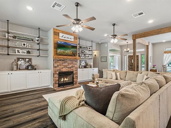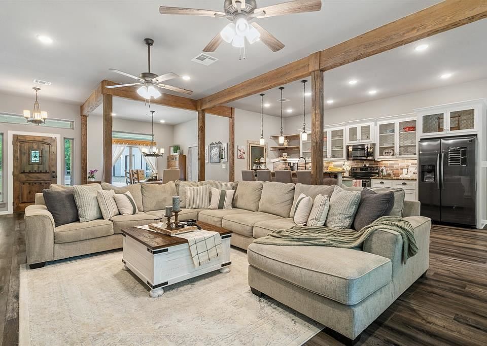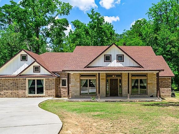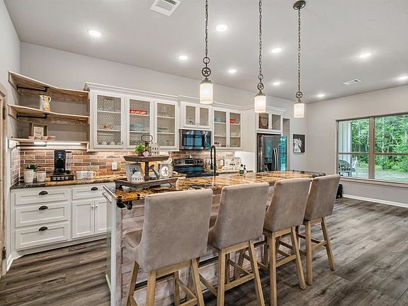 This secluded 4.81 acre property is like a breath of Fresh Air, surrounded by a Natural Green atmosphere. The ONE story Ranch style has a very casual feel as one drives up. Upon entry one will smile as this inviting home unfolds to gathering, cooking, a home office & dining areas with engineered flooring or tile through out. Large natural wooden beams complete the style well. The central kitchen is well equipped with granite prep areas, a Farm House sink, abundant storage space & an expansive breakfast bar. The Primary Suite was designed for privacy and has a stunning wood slat cathedral ceiling and spa-like bath. A 40x40 Shop and covered area for RV, Boats, Trailers, extra equipment sit to the side. This unassuming property of 4.81 acres is a hidden GEM, close to all Amenities, Medical, MISD, and horse friendly! Definitely a MUST SEE. If a casual, country, private feel is your dream, look no more! So many possibilities for future custom outdoor amenities. Occupied, appointment only.