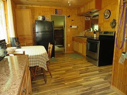 Updates throughout and meticulously maintained, this 1,080 sq ft, two bedroom, one bath home has well and septic and working outhouse if needed, large living area, sunroom, mudroom, a single bedroom and a larger bedroom perfect for adding more bunks or beds and warm wood details. Updated 3/4 bath, modern kitchen, attractive laminate flooring throughout, wood stove in the living room does a great job warming up this property and stays warm with double insulated walls. Back up propane wall unit, 100 amp CB electric system, partial basement, large 12x20 shed/garage, an expansive deck with some under cover for grilling, relaxing or entertaining. Home will come partially furnished. Sellers using Dish Network and property taxes are $1142.95 total. There is a recorded ROW for neighbors access to their property behind this parcel. meticulously maintained. Taxes $1142.95.board and batten stained exterior