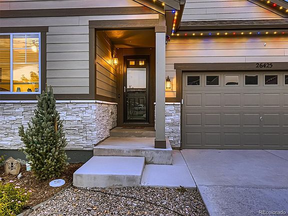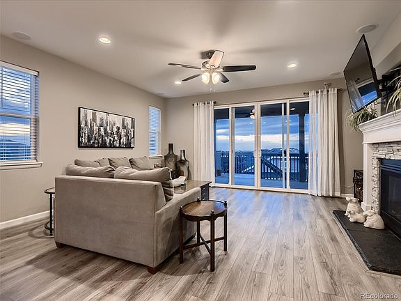 Every Possible Upgrade is in this Better Than New Serenity Ridge Stunner, with Mountain + Lake Views and the Finished Walk-Out Basement of Your Dreams! Large, mature trees and lush landscaping installed means need to wait for things to grow as with most new homes. The heart of the home is the gourmet chef's kitchen with exotic slab granite counters, large island with seating, designer lighting, soft close cabinetry with crown molding, black stainless steel appliances with French door fridge, gas range, and double ovens, custom backsplash, and Closet Factory custom pantry. The open yet cozy family room has a stone fireplace with mantle and hearth, high ceilings, on-trend wide plank flooring, built-in surround sound, and a tremendous stacking glass wall that opens for maximum indoor/outdoor living. The primary suite is very sizable with impressive hard flooring, spa like en-suite bath, and a custom Closet Factory closet. Two additional spacious bedrooms, full upgraded bath, and laundry room with cabinetry and utility sink are on the main floor as well. This basement wows with soaring ceilings, massive gathering room with surround sound, billiards space, and a full kitchen/wet bar with full size appliances. This is a great hangout, home theater, playroom, work from home, or mother-in-law/teen suite space. Open your full wall stacking glass doors to enjoy Colorado's famous 300 days of sunshine from your oversized covered deck that boasts views of the mountains and Aurora Reservoir. Or head out the walk-out slider to the full patio slab with hot tub and walking path. Don't miss the Gemstone permanent holiday lights, many custom closets, and garage cabinetry/shelving. Serenity Ridge is a remarkable community, nestled between the heart of Southlands and just 10 minutes from Downtown Parker. You have endless shopping, dining, and entertainment options, and easy access to all major traffic thoroughfares. Come visit today!