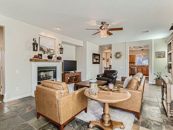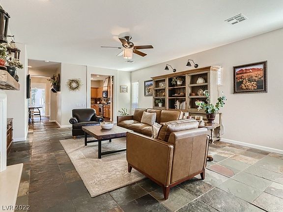 Highly upgraded and lovingly maintained home in Anthem Highlands. Single Story. A Craftsman's Dream - custom woodworking throughout: window casings, pantry door, fireplace mantel, baseboards all created for this particular home. Large, gourmet kitchen featuring cherry cabinetry, granite counters and stainless steel appliances. Designer touches make this house a home: shiplap feature in the large laundry room, decorative wall feature in the primary bedroom, slate flooring, barn door and recently renovated bathrooms. Beautiful curb appeal - large courtyard entry and dramatic valley mountain views from the entrance.